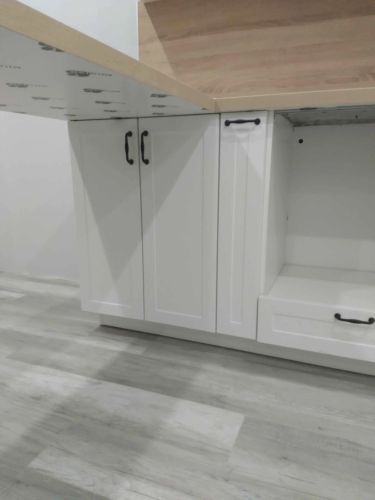 Соберём каркасы, навесим шкафы, дверцы и фурнитуру. Всё отрегулируем. Установим, мойку с сифоном и смесителем.