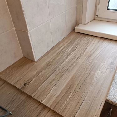 Подгоним под размер, сделаем выпилы под коммуникации и установим столешницу. Наклеим кромки. Работа займёт 2–4 часа. Будет шумно.